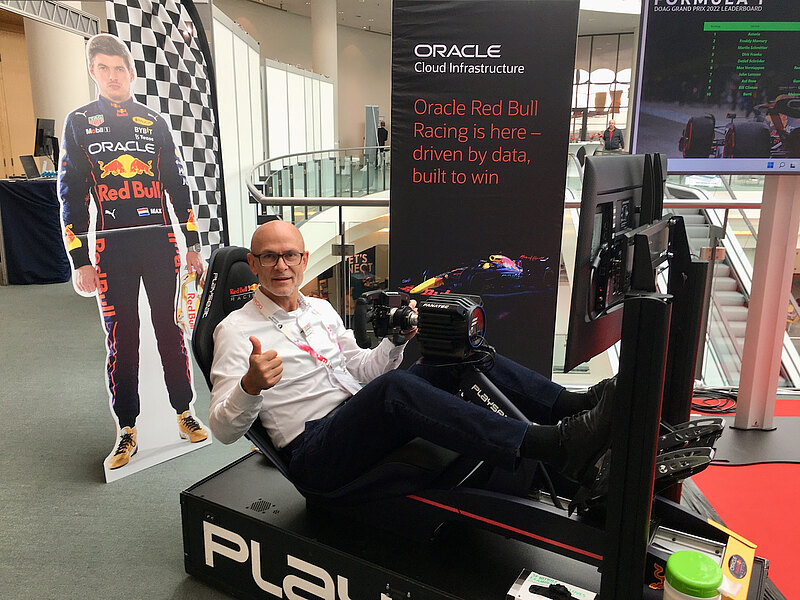Das Rahmenprogramm der Konferenz + Ausstellung hatte mit einem Community Barbecue am Dienstagabend samt Pit Stop Game by Oracle zwei besondere Highlights zu bieten. Diverse Teams hatten sich gefunden, um den Formel-1-Weltrekord beim Reifenwechsel des Red Bull Racing Team zu knacken (was unseres Wissens auch am Mittwochabend nicht gelang). Das Barbecue erfreute sich trotz des Regens, der beim Schlange stehen so manchen nass machte, großer Beliebtheit.