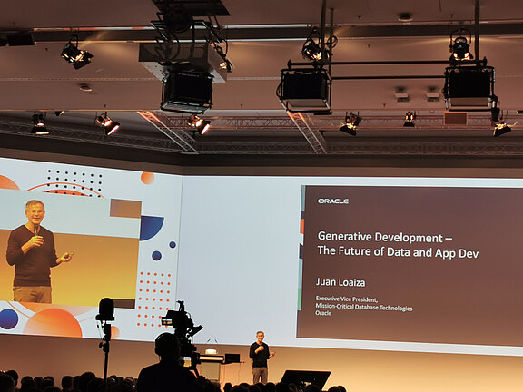Mit direkter Überleitung übergab er das Mikrofon an Keynote Speaker Juan Loaiza. Dieser befasste sich in seiner Keynote mit dem Thema “Generative Development - the Future of Data and App Dev” in Oracle 23ai.