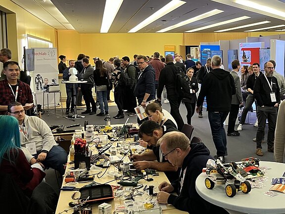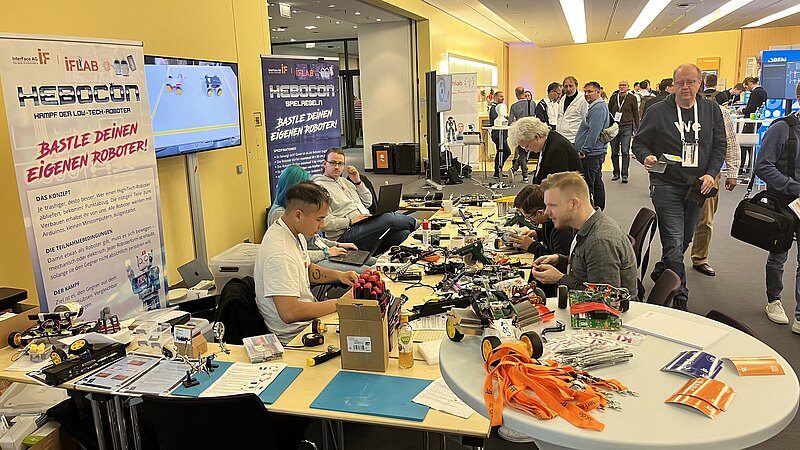 Das Programm wird auch heute von einer kleinen Ausstellung und dem KI Lab begleitet, das zum Testen und Networking einlädt. Es wird sich ausgetauscht, gelacht und ausprobiert: An einer Ecke werden kleine Roboter gebaut, die später in einem Hebocon-Turnier gegeneinander antreten, an einer anderen Ecke kann man mit einem KI-Android plaudern, dazwischen können Deepfakes bestaunt werden, die in Echtzeit generiert werden – überall ist etwas los.